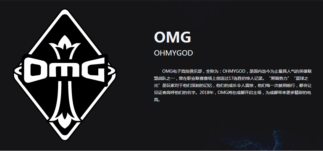 OMG电子竞技俱乐部,全称为:OHMYGOD,是国内迄今为止最具人气的英雄联盟战队之一,曾在职业联赛赛场上创造过17连胜的惊人记录。“黑暗势力”“星球之光”是玩家对于他们深刻的记忆,他们的成长令人震惊,他们每一次披荆前行,都会让见证者高呼他们的名字。2018年