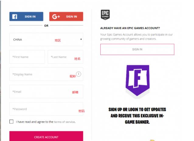 在弹出的注册框依次填写地区、姓名、昵称、邮箱、密码,并且勾选同意协议,然后点击“CREATE ACCOUNT”;