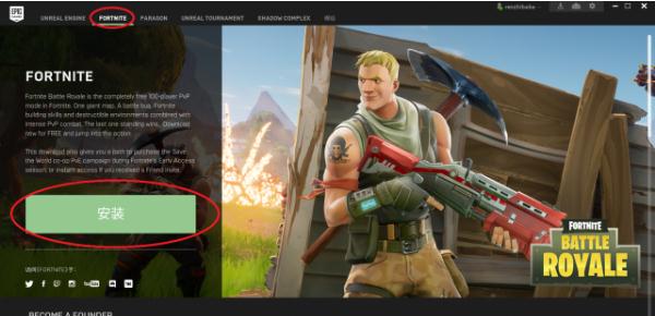 选择“FORTNITE”游戏选项,进入游戏页面后点击左下方的“安装”按钮,然后下载游戏;