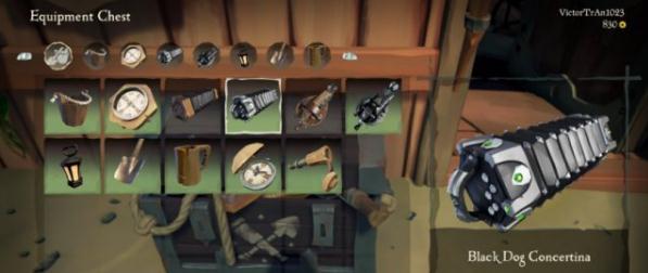 此黑狗套装本来是预购玩家才拥有的,但 Xbox Game Pass 用户也发现他们拥有这套装,里面包含:帽子、眼罩、外套、腰带、裤子、靴子、铁脚、风琴、提琴、弯刀,一共10件物品。但很多玩家找不到哪里可以装备它们。虽然玩家每一次重生的前哨(Outpost)都不同,但它们都会出现服饰商店、武器商店和装备商店,除此之外船上也有同名的箱子 Chest 玩家在那里换装。商店都会有很明显的标志挂在上面,让玩家识别。