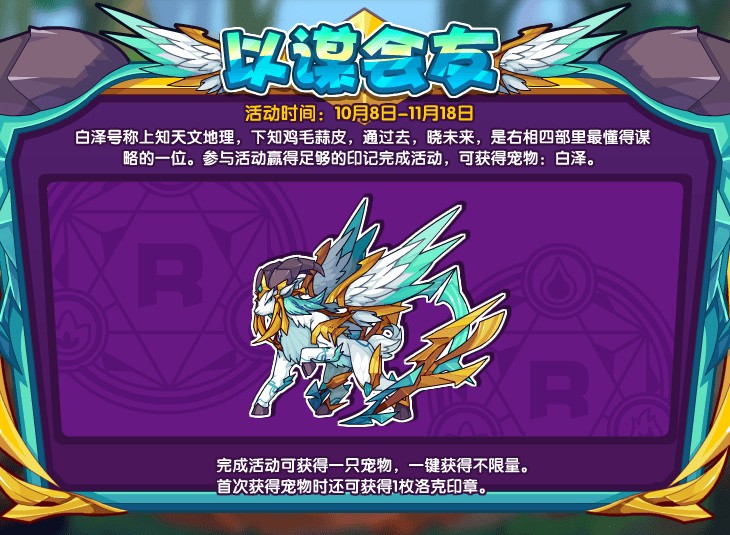洛克王国以谋会友是即将推出的活动,活动的内容:白泽号称上知天文地理,下知鸡毛蒜皮,通过去,晓未来,是右相四部里最懂得谋略的一位。参与活动赢得足够的印记完成活动,可获得宠物:白泽。