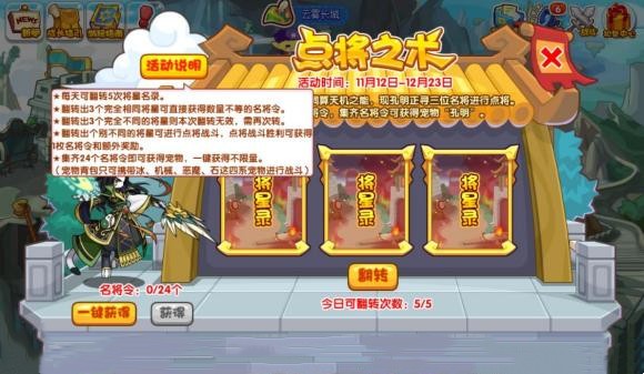 1.这个活动就是抽卡,出现2-3个一样的开启点将玩法,也就是打怪,翻出俩,打赢了给1,翻出3,直接给3,逃跑会失去此次点将资格