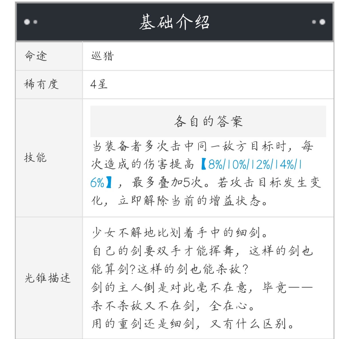 论剑则主要面对BOSS环境,对单叠五层能达到80%的增伤,非常恐怖,但是一旦换目标就失效了。