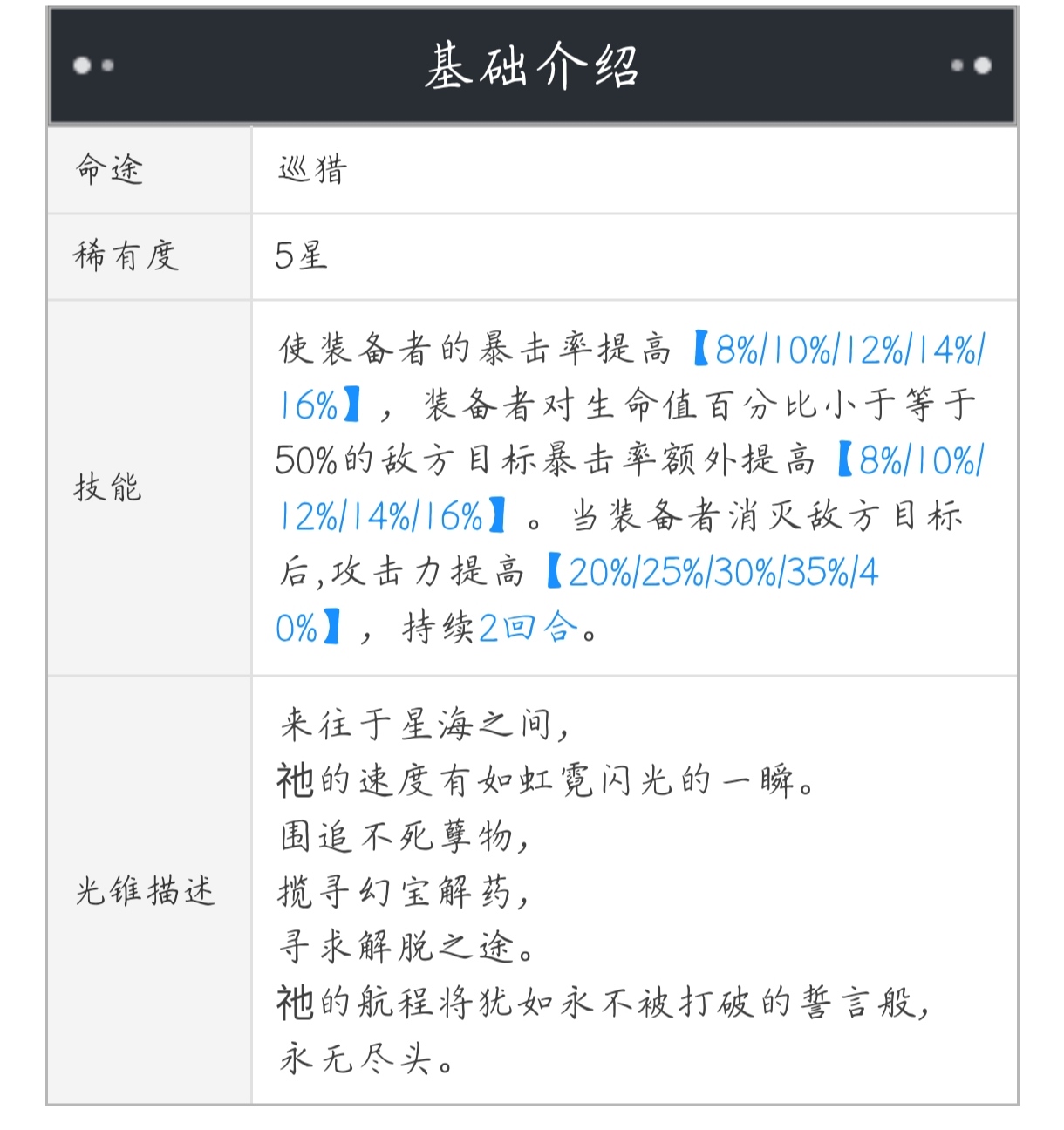 如果没有最后一句“三回合可触发一次”的话,那就妥妥彦卿神器,直接不用聊了,都推荐大家专武了,但可惜这个暴击率buff给的太吝啬了。