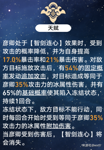 2,当彦卿吃到智剑连心的效果时,攻击敌人有固定概率(无法用效果命中提升)对敌人发动追加攻击,并有65%的基础概率冻结敌人一回合