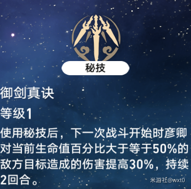 1,战斗前给自己上buff,提高战斗开始后2回合内彦卿对生命值高于50%敌人的伤害