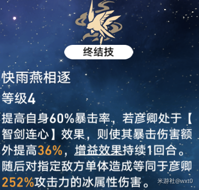 2,提高彦卿60%的暴击率,如果彦卿有智剑连心的效果还会额外提高彦卿的暴击伤害,同时智剑连心的效果也还在,两者加一起能给彦卿提高大量暴击暴伤,大招效果持续到彦卿下一次使用普攻或战技