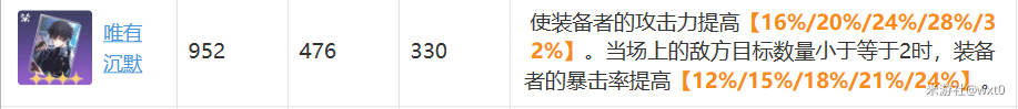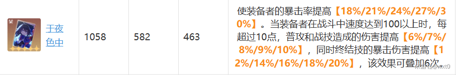 能够提高暴击率和技能伤害,比较适合彦卿,但是吃满效果需要160速度,彦卿只有后期有个10%的加速,就算带速度鞋靠自己也没办法吃满效果,如果实在是有专武没希儿可以给彦卿用。