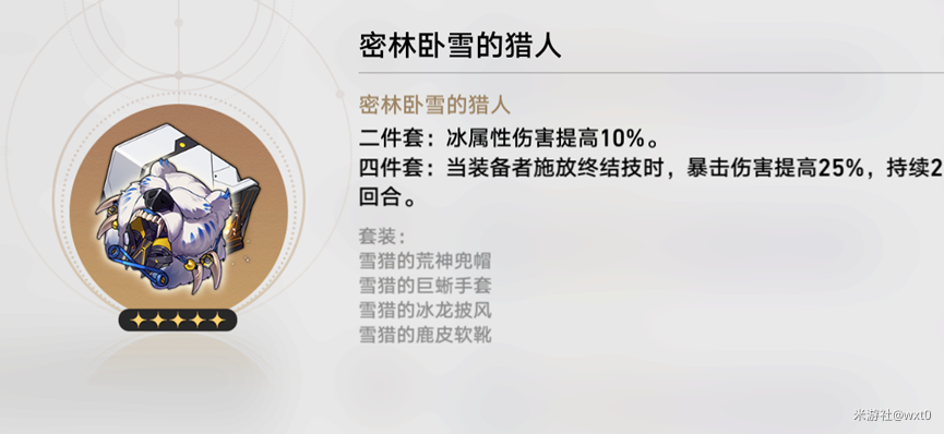 2,4件套目前密林卧血的猎人是最适合彦卿的,除了加冰伤外还能在放大的时候加暴击伤害,很契合彦卿的技能机制。前期可以用野穗伴行的快枪手和密林卧血的猎人组成2+2过度。