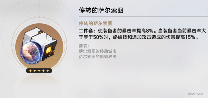 停转的萨尔索图,可以增加暴击率,大招伤害和追加攻击伤害,彦卿也是有追加攻击的,如果没用暴击率武器更推荐用这套,还能进一步降低暴击率的需求。