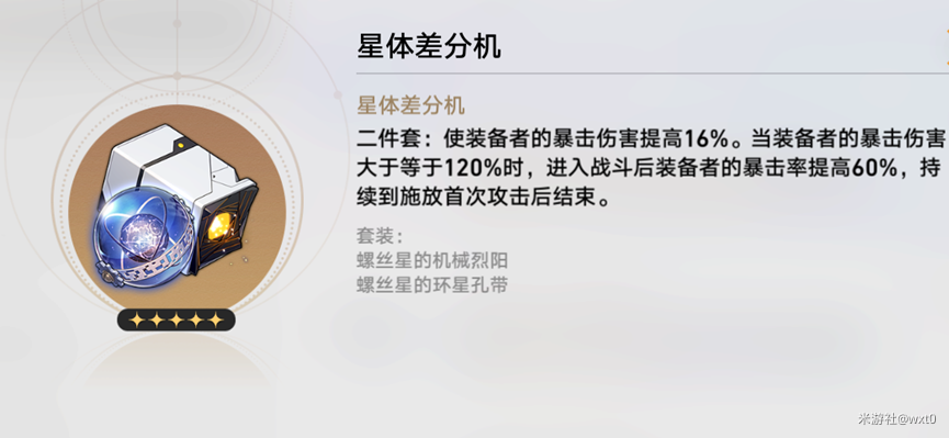 星体差分机可以额外提高16%的暴击伤害,不过特效实在是没用,但如果副词条歪了一堆攻击力,没啥暴击伤害,暴击率也够了,也是可以用的。