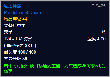 蓝色装绑双手斧,39等级要求,4.0攻速,掉落自奥达曼。单看这些名字,很多人就都能猜到是那把号称“战场收割机”的厄运钟摆。时至今日,厄运钟摆依旧是唯一一个有着4.0攻速的武器,它不仅秒伤高达38.9,还附带一个特效,击中后有几率对目标造成250-350点伤害。