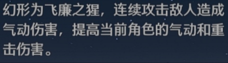 技能为:幻形为飞廉之猩,连续攻击敌人造成气动伤害,提高当前角色的气动和重击伤害。(简述)
