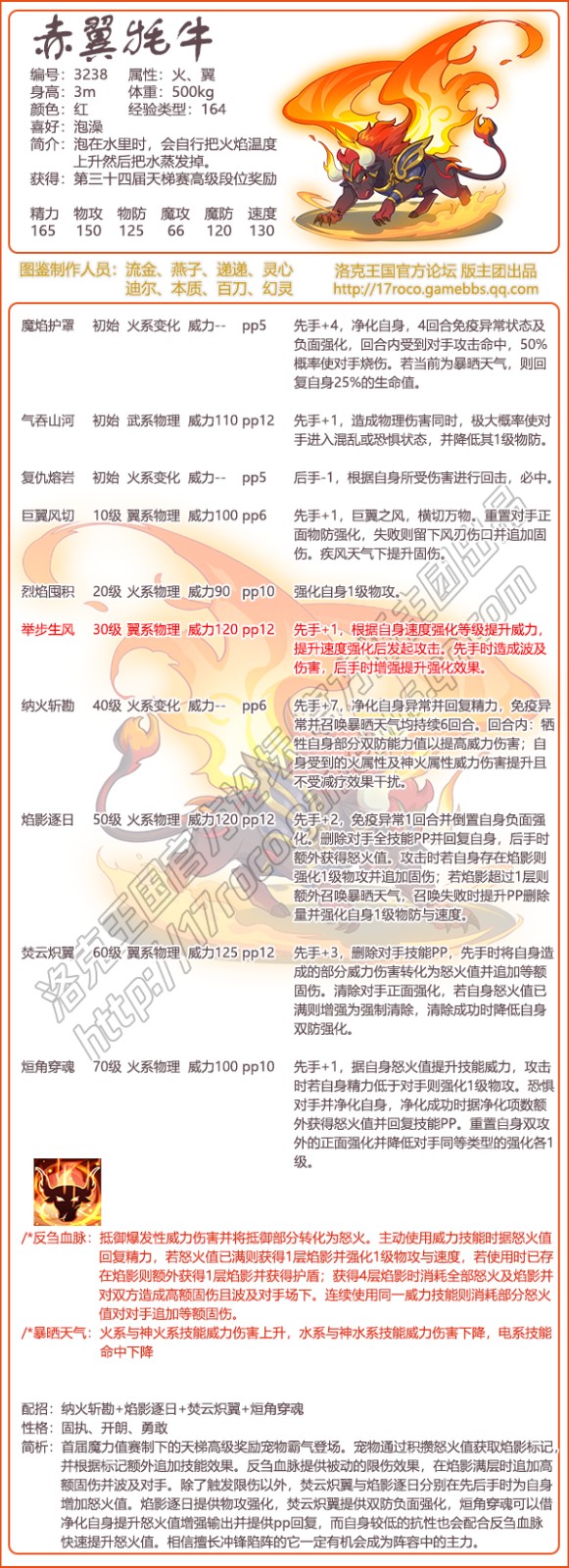除了触发限伤以外,焚云炽贾与焰影逐日分别在先后手时为自身增加怒火值,焰影逐日提供物攻强化,焚云炽翼提供双防负面强化,烜角穿魂可以借净化自身提升怒火值增强输出并提供pp回复,而自身较低的抗性也会配合反刍血脉快速提升怒火值,相信擅长冲锋陷阵的它一定有机会成为阵容中的主力。