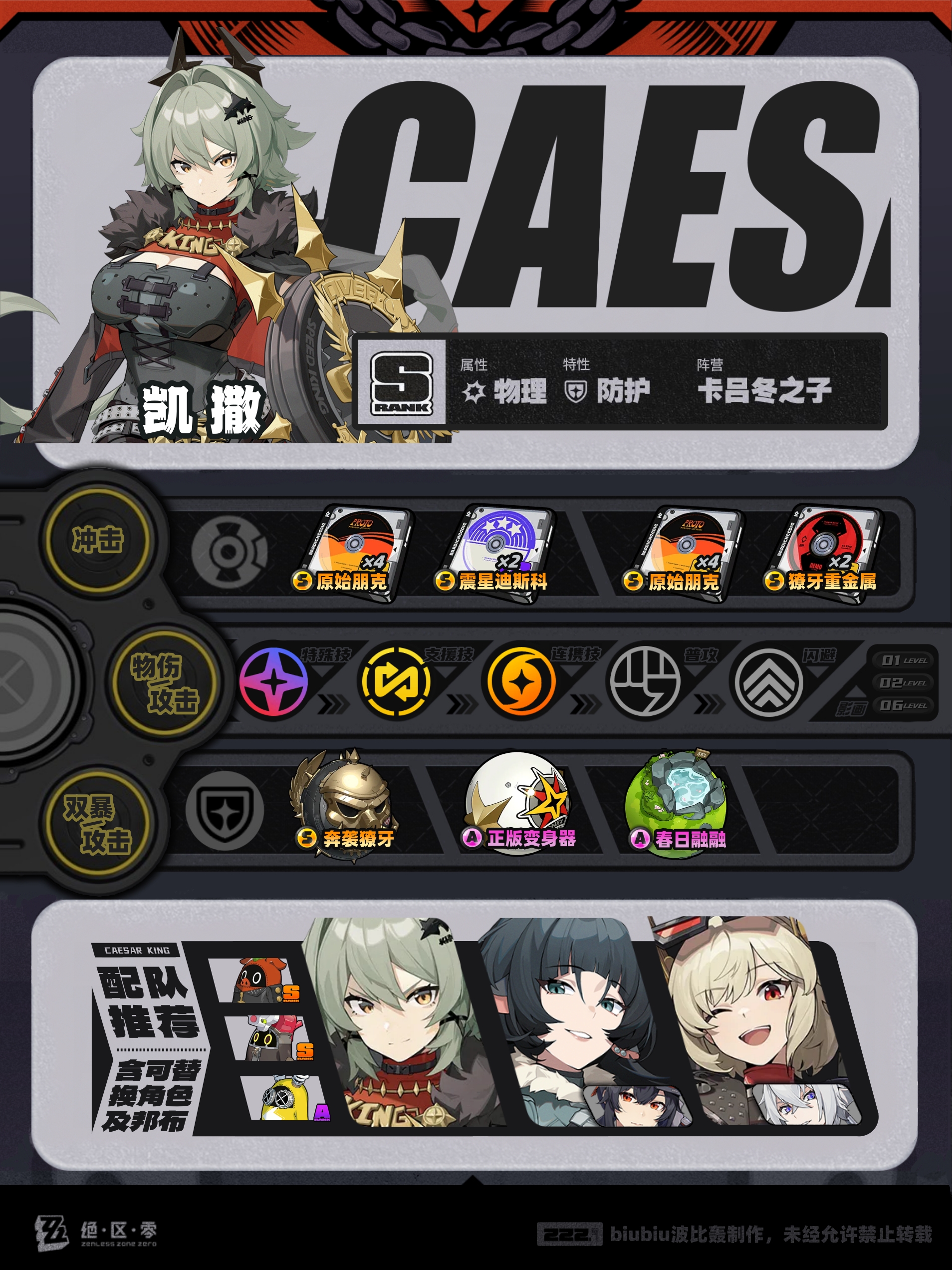 凯撒:首个限定防护角色,属性为物理;她的保人能力让我愿称之为ZZZ的钟离,实战开场释放E技能(强化特殊技/触发精准格挡)后只需挂到后台即可,此时前台角色获得护盾,之后可利用强化特殊技、连携技、终结技等多种方式刷新护盾;