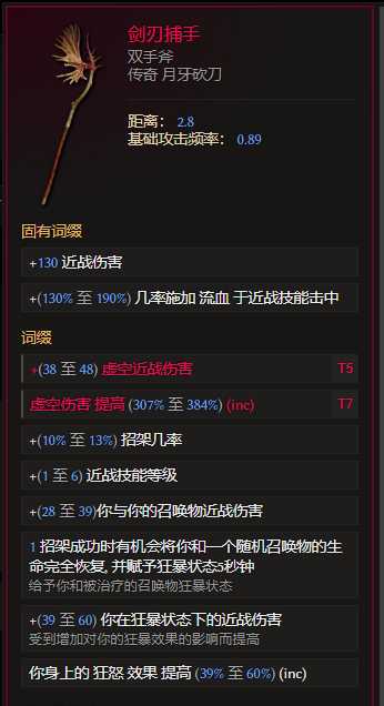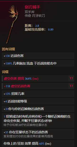剑刃捕手自带大量点伤词缀,最多提供+6近战技能等级,并且通过堆活力还有大量近战点伤拿,还可以联动吞噬球拿最多20%more虚空增伤,非常适合本bd,超大的攻击范围弥补近战手短缺点。