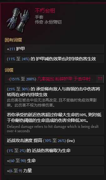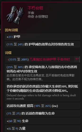 手套:不朽台钳 超级阿波罗斯出品,大量减伤,提升生存明显。但是超级阿波罗斯对近战太难了,可用基底永恒护甲紫装代替 属性自行搭配,不绑定但是提升很大。也可以用血法师之握,世界掉落,减伤也不错。