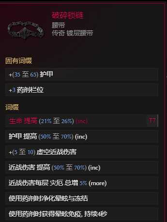 腰带:破碎锁链 120+腐化水晶boss出 比较稀有 合成高生命%其次复合生命% ,必须配合痛苦虹吸戒指使用 ,否则20%more近战增伤拿不到