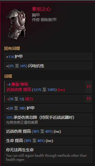 胸甲:泰坦之心 世界掉落 合成词缀撕裂等级优先 其次活力 生命% ,自带减伤和大量血 双手近战必备