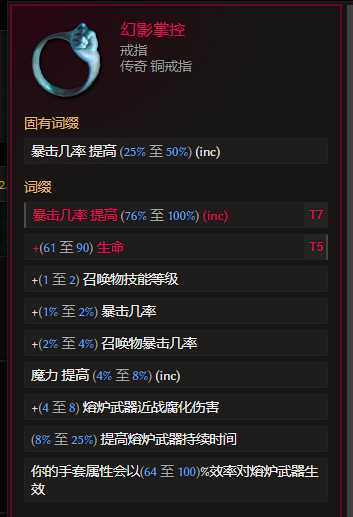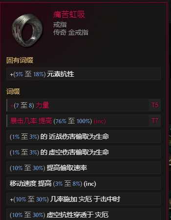 戒指:痛苦虹吸(增加腐化的boss必定掉),合成词缀 优先 t7暴击率% 腐化水晶boss出 灾厄几率尽量高 大量吸血也是亟需属性;另一个选幻影掌控 世界掉落 合成优先t7暴击率,选+2暴击率 基底暴击率高的戒指合成 第二个词缀优先力量或者生命