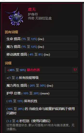 护身符:虚无 阿波罗斯专属掉落 合成词缀推荐暴击伤害 用+2等级的。狂怒时间选个3s以上的,翻滚闪避拿狂怒配合武器和遗物的狂怒效果,很舒服,翻滚一次多50%+攻速,和武器大量狂怒点伤