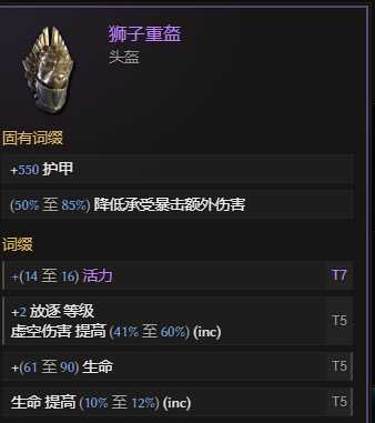 头盔:狮子头 高基础暴击减伤~优先高生命%和活力 其次放逐等级 ,基底尽量高roll