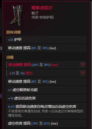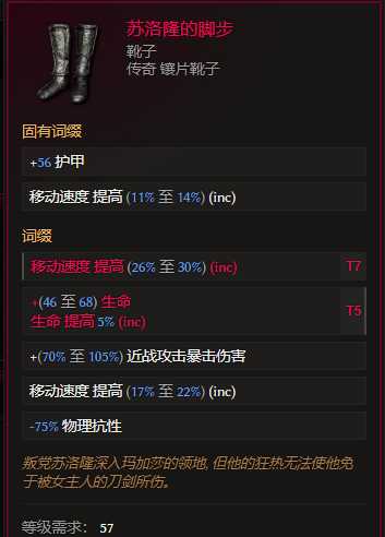 靴子:苏洛隆的脚步 世界掉落 。合成词缀优先跑速 其次带个生命%,2t7情况下 生命换成活力,追90+活力 吞噬球给的more伤翻倍。日常刷图可以换暗影迷踪靴子(世界掉落),合成词缀相同,跑速多20%~