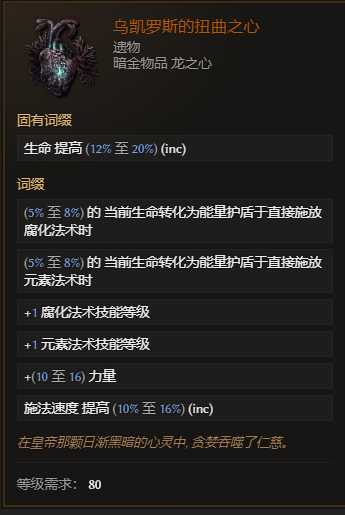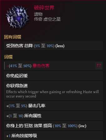 遗物:破碎世界 。超级阿波罗斯出品 属性太强。不绑定但是提升很大~合成词缀暴击伤害。没有就用龙心,85时间线boss专属掉落的暗金也不错,但是取得基础暴击要从别的词缀压缩找~