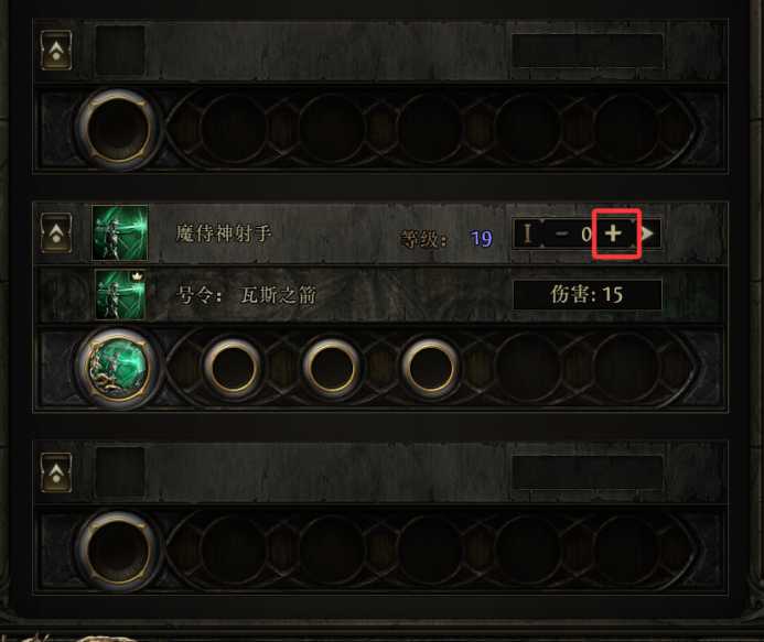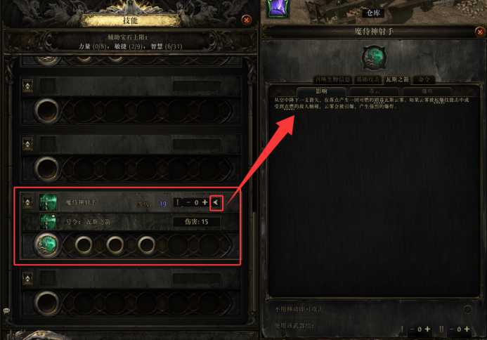 然后按G将魔侍神射手装备到我们身上,并且点击右下角的技能栏,将他的主动技能,号令瓦斯之箭放在我们的快捷键上面。这样我们就可以使用他的主动技能了。并且别忘了在技能面板点击魔侍神射手的加号给他加1数量,不然是没有生效的。骷髅召唤物的存在是需要消耗我们的最大精魂数量,不过不用担心,他们随着等级的提高会降低精魂要求的数量,并且剧情中我们也可以通过完成任务获得更多的精魂数量。所以在你剧情过程中,每成功提升一次召唤物等级/提升一次你的精魂数量上限,都要来技能栏看一下能不能增加魔侍神射手的数量,这样才能保证我们的输出最大化。