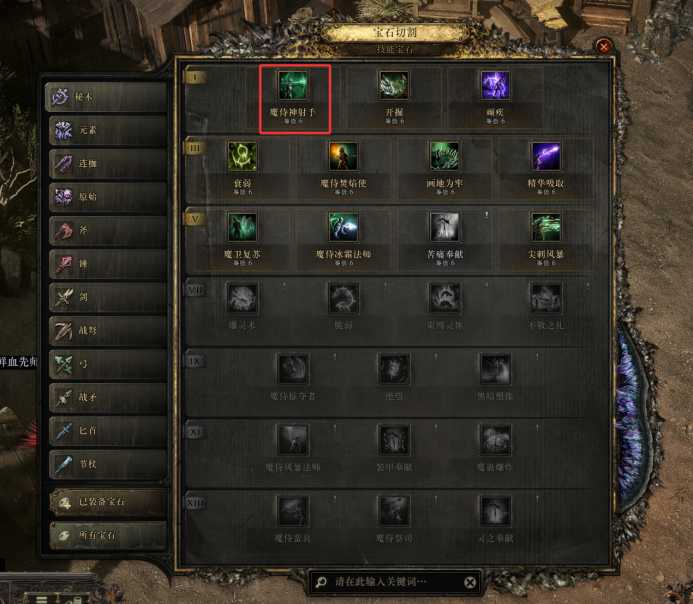 便可以获得两个1级辅助技能宝石,打开辅助技能宝石,选择魔侍神射手,然后点击左下角所有宝石。