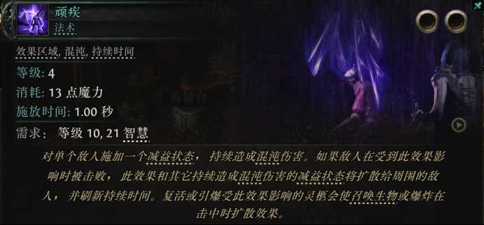 这个技能宝石选择拿顽疾技能,该技能只需要丢给一个敌人,这个敌人被击败之后可以将顽疾扩散到周围的敌人身上,帮助我们辅助清图,是很强的前期开荒技能。