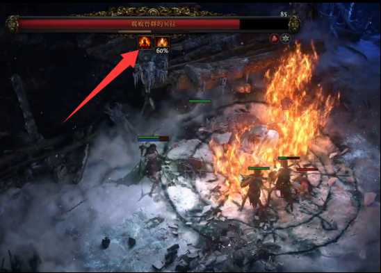 所以我们就可以对敌人丢烈焰之墙,注意,敌人一定要在烈焰之墙里面,才会叠加右边的百分比属性,然后持续的叠加敌人身上的燃烧强度,在叠加到一定程度之后,敌人便会被点燃(左边的是点燃标签,右边的是点燃强度)
