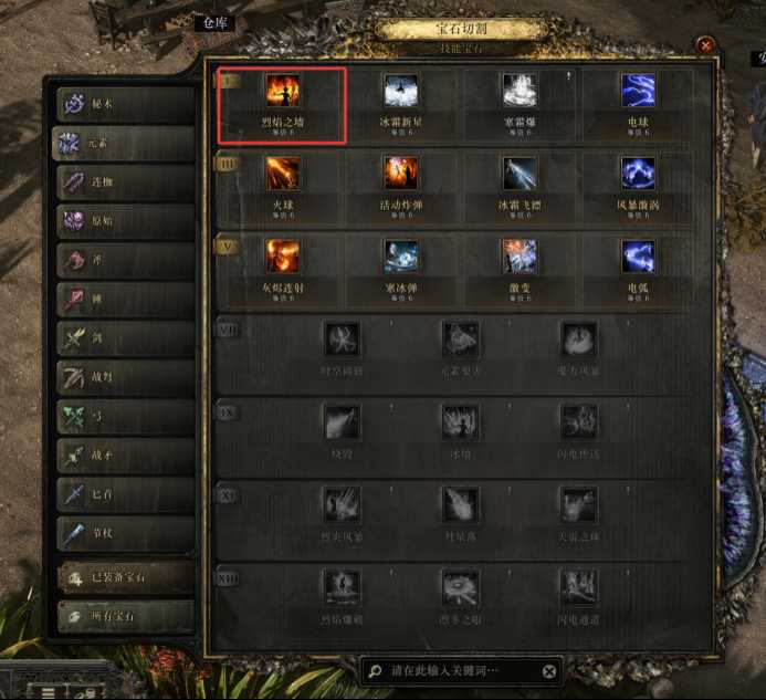打开技能宝石,左边一排选择元素,然后将烈焰之墙这个技能拿出来装备在我们的身上,并且将它设置到我们的技能栏上方便我们进行使用。