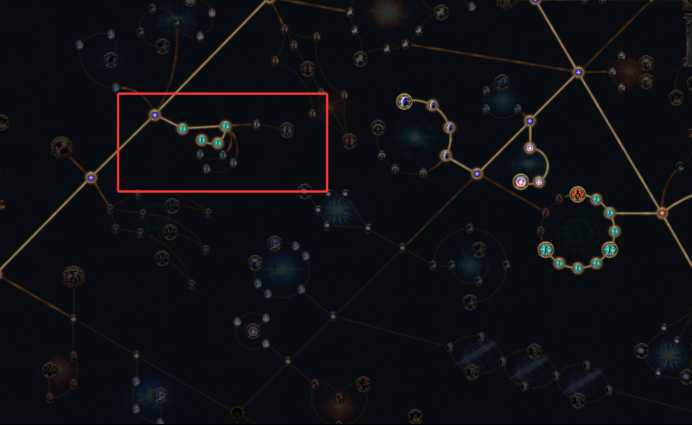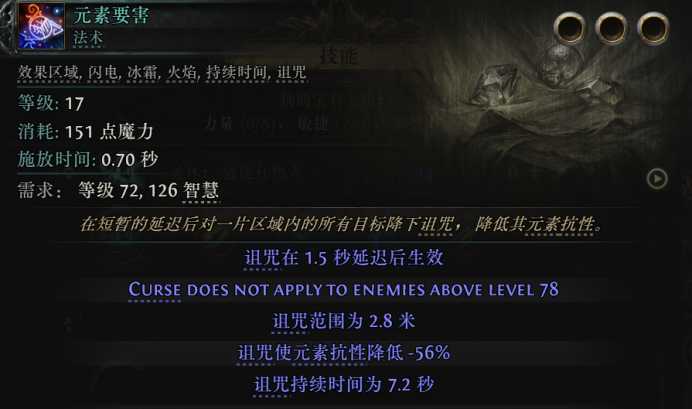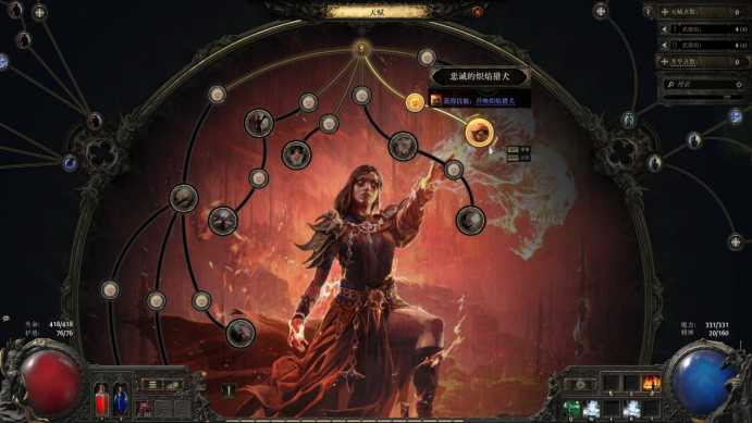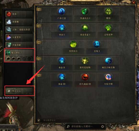 如果打到第二个2级辅助技能石,就给魔侍神射手换一个二级辅助“奉命1”替换火焰协调主动技能等级够了就可以在元素分栏拿一个元素要害诅咒降低敌人抗性。