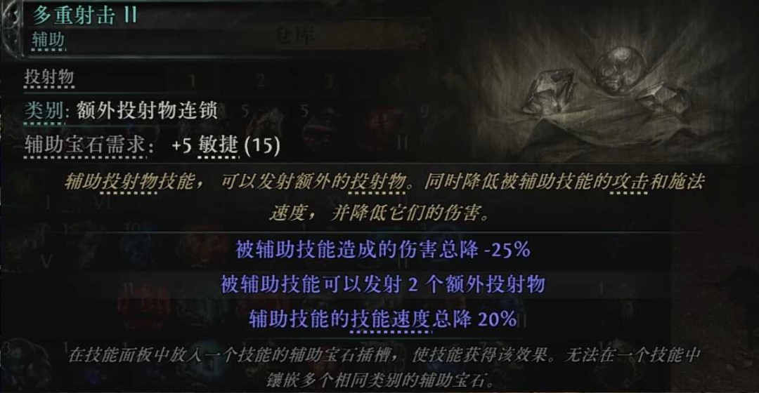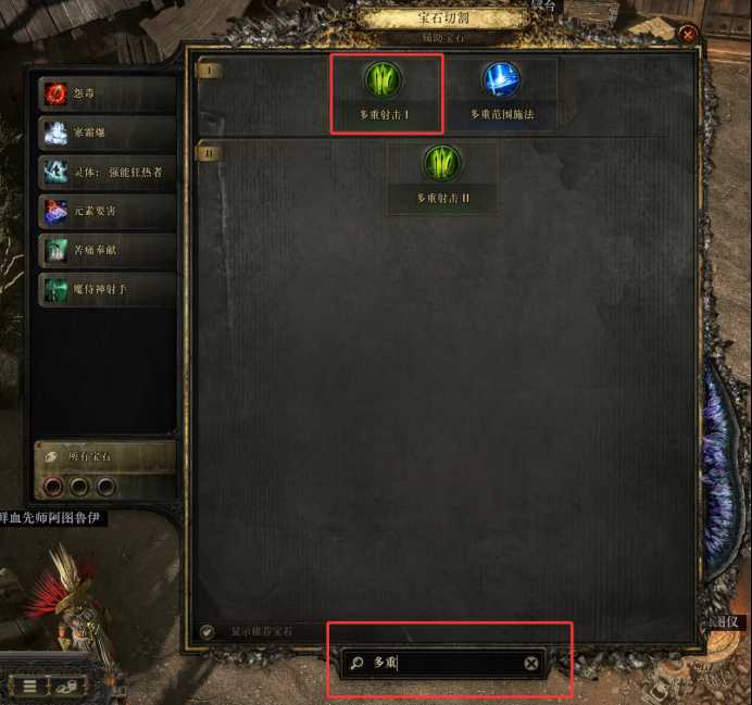 输入多重,选择多重射击1并且把他拿出来,装备在我们的魔侍神射手的孔上,这样就能让我们的毒气箭矢一下射出去3根,都射中点燃的敌人就会同时造成3次爆炸伤害。