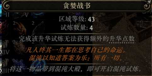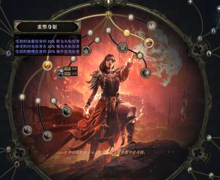 后便可以前往幻渺湿地,在幻渺湿地狮蝎被打败之后可以获得贪婪战书,拿到贪婪战书之后不着急,先去他后面进下一张“佳华尼的机械迷城”地图后,激活传送点之后,再前往幻渺湿地的混沌大殿。完成该地图之后可以获得全新的两点升华点,点出转伤升华重塑身躯,这样我们就可以在尽量投资火焰抗性的情况下也能有不错的生存。
