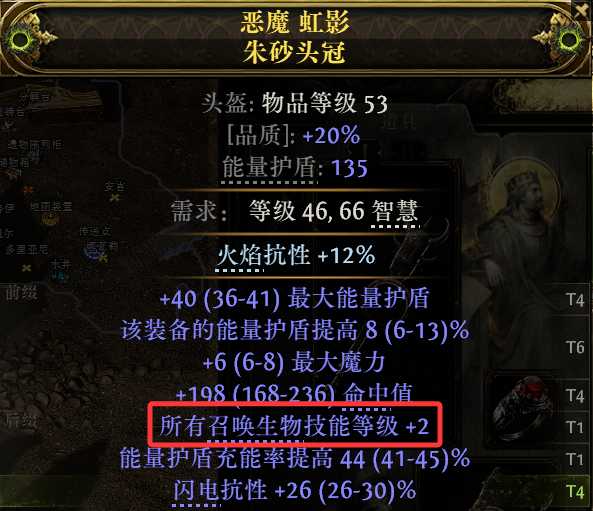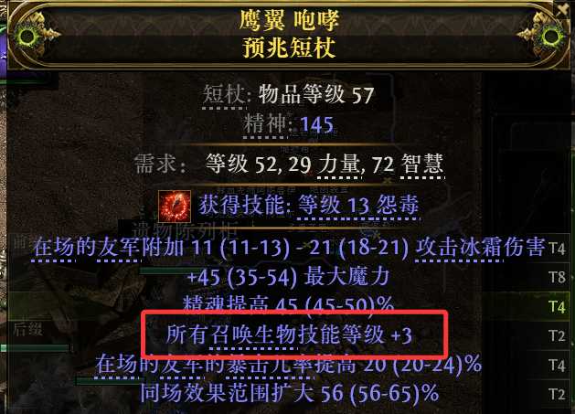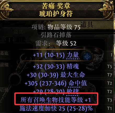 权杖找更高的召唤等级(最高+4),头盔找更高的召唤等级(+2最高)和盾,项链最高能加3召唤技能等级,还能附带精魂如下图所示。