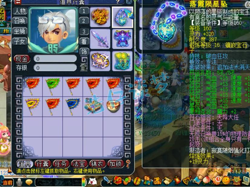 160级专注破血狂攻满天花雨套项链,打了16锻舍利子,不过专注特效对于大唐官府来说作用不是很大。