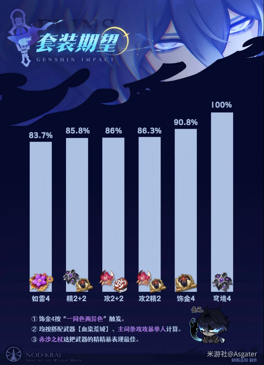 ①【穹境4】是最契合菲林斯的套装——降低圣遗物暴击需求、更易满暴。