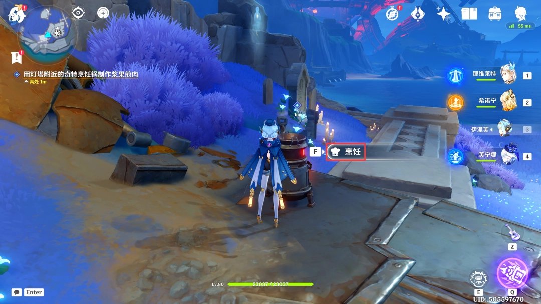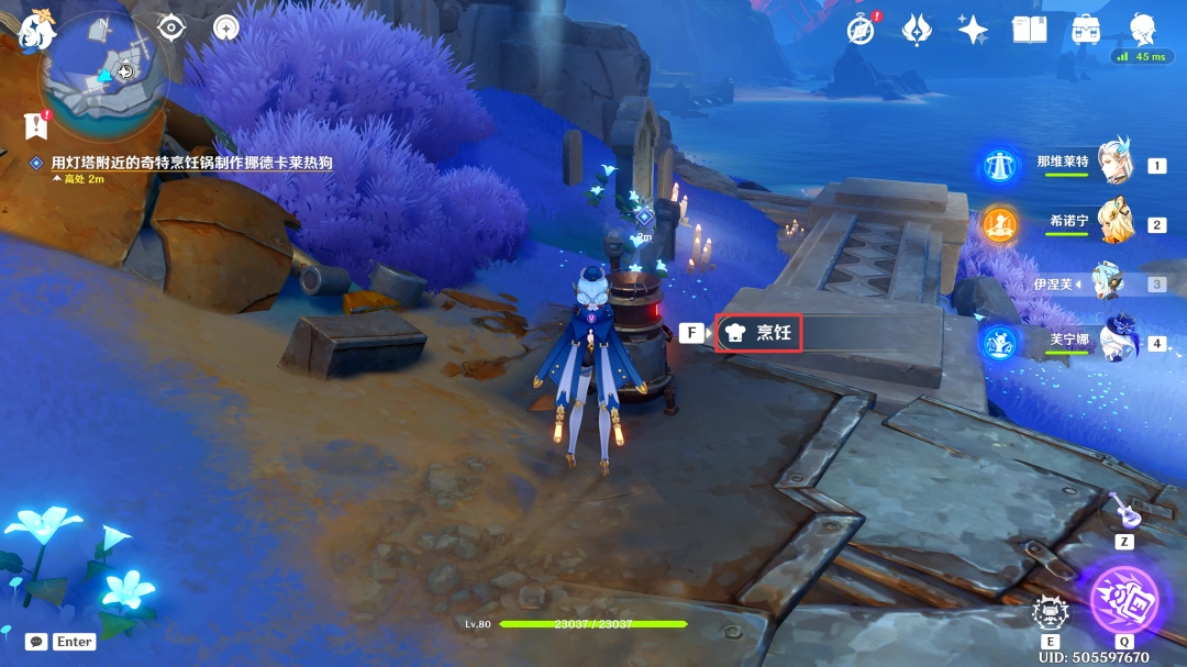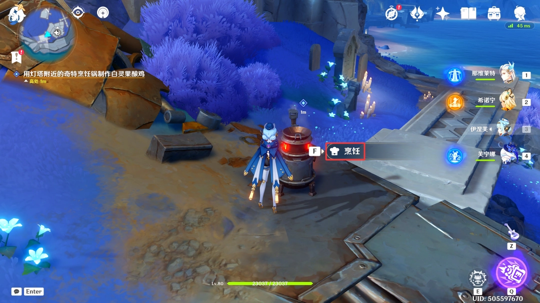 来到此处后,我们飞下去靠近烹饪锅,与其交互,烹饪任意一道料理后,退出烹饪界面