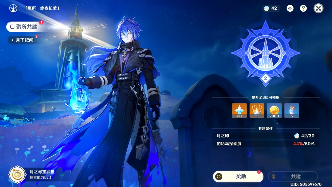 来到此处后,我们将「聚所·终夜长茔」升至2级,退出界面,即可触发任务「救助小队的诉说」(「聚所·终夜长茔」升至2级需要60个月之印,帕哈岛探索度需要达到30%)