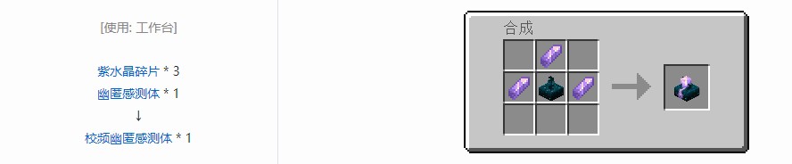 与普通的幽匿感测体相比,校频幽匿感测体的纹理上有一条紫水晶条痕,校频幽匿感测体不会向条痕方向输出红石信号。