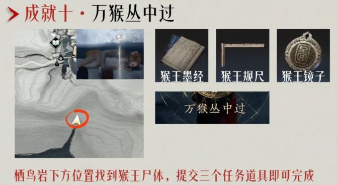 栖鸟岩下方位置找到猴王尸体,提交三个任务道具即可完成