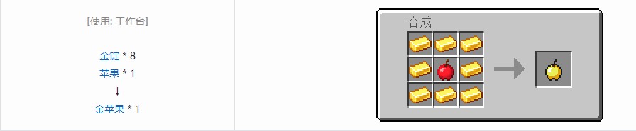 普通金苹果提供2分钟的伤害吸收I效果(提供4作伤害吸收)与5秒的生命恢复II效果(每25刻1点),每秒×0.4,共恢复4点)。
