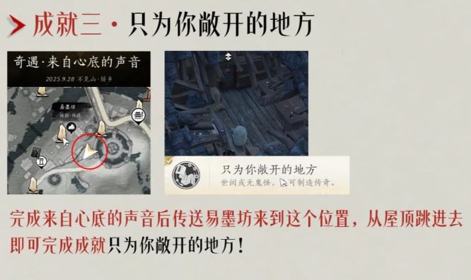 完成来自心底的声音后传送易墨坊来到这个位置,从屋顶跳进去即可完成成就只为你敞开的地方!