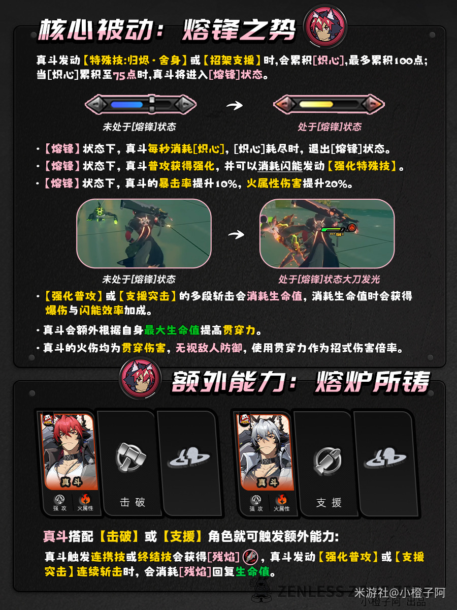 ④ [熔锋]状态下,真斗的暴击率提升10%,以及火属性伤害提升20%,提升真斗在[熔锋]状态的伤害。