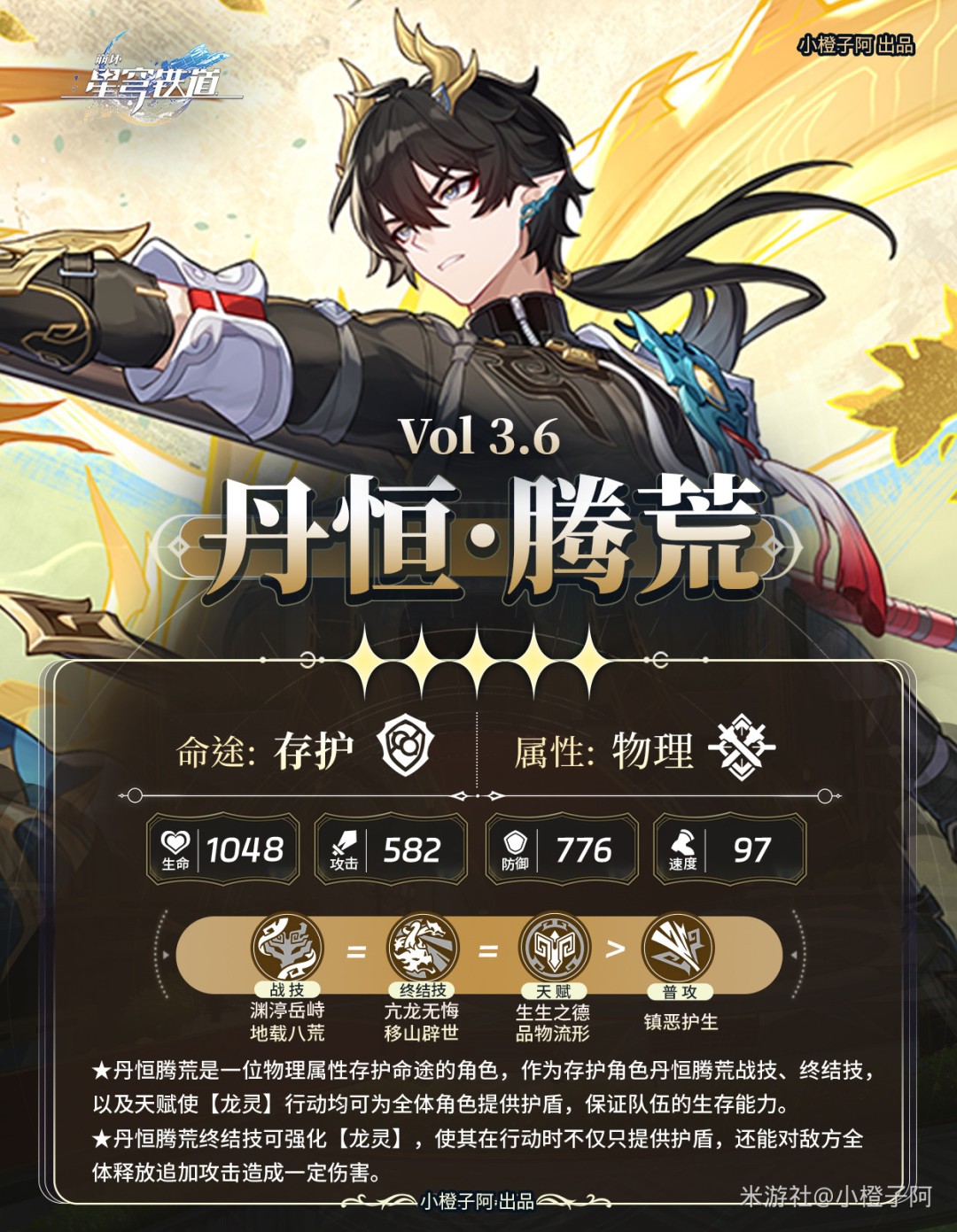 丹恒腾荒是一位物理属性的存护命途角色,作为存护角色丹恒腾荒战技、终结技,以及天赋使【龙灵】行动均可为全体角色提供护盾,保证队伍的生存能力。