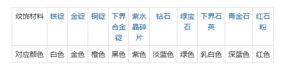 纹饰材料可以是铁锭、金锭、铜锭、下界合金锭、紫水晶碎片、钻石、绿宝石、下界石英、青金石或红石粉,不同的纹饰材料添加的纹饰颜色不同。