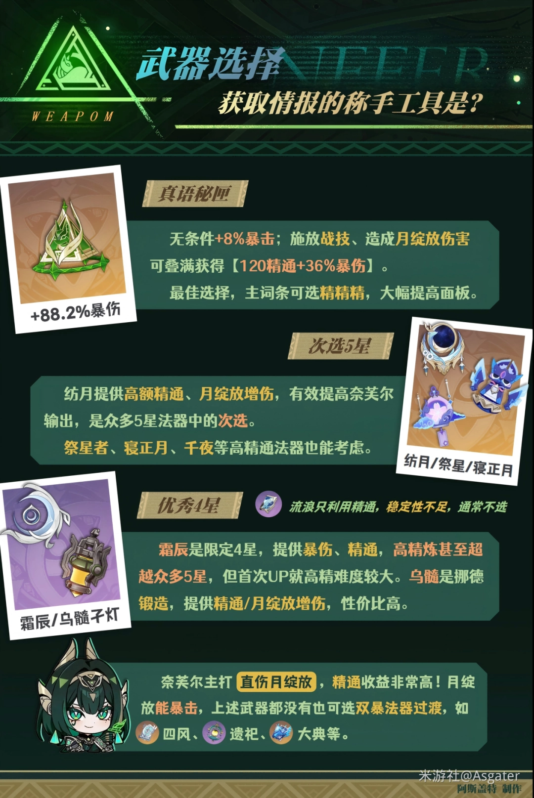 ②【纺月天镜】凭借高精通、全队月绽放增伤“名列前茅”,与高精霜辰“旗鼓相当”。不过,尽管排名靠前,考虑到该武器的月绽放增伤是全队增益,仍可水草法器队友携带、奈芙尔选择其他差距不大的法器,达到“1+1>2”的效果。