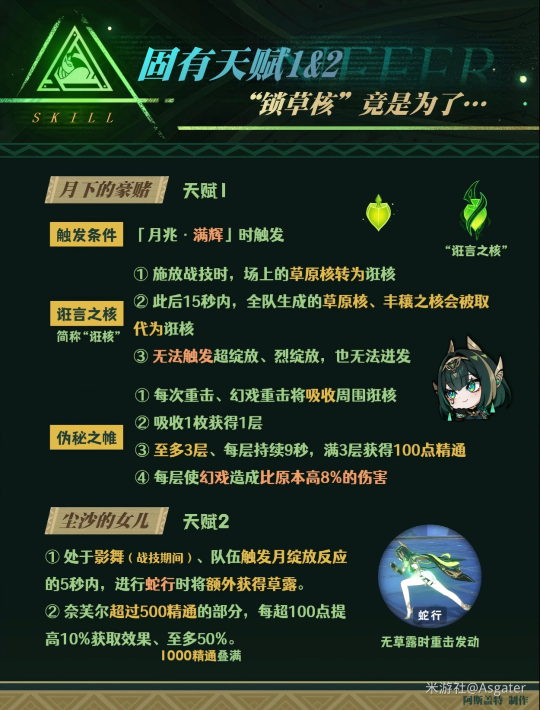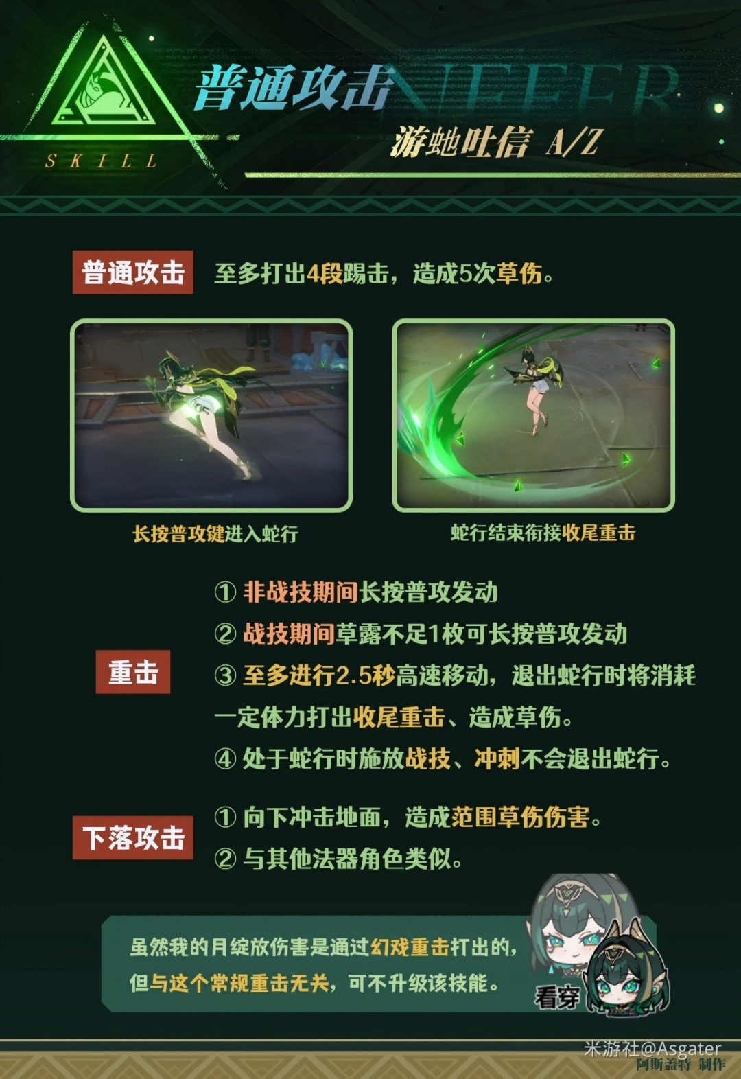 ◆若是至少1枚、甚至至少2枚草露时施放战技,长按普攻将消耗草露打出幻戏、不会进入蛇行,故不会触发该天赋。
